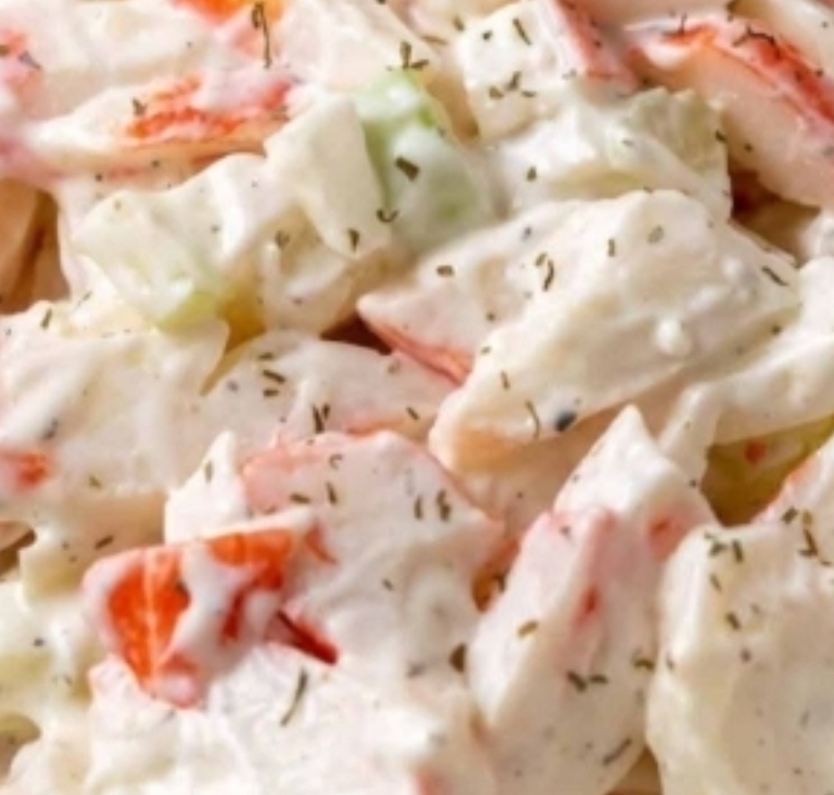 This refreshing and creamy seafood salad is quick to make, budget-friendly, and perfect for sandwiches, crackers, or a light chilled meal.   ▶️Ingredients (paragraph style): Imitation crab meat (chopped), mayonnaise, sour cream, diced celery, diced red onion, lemon juice, garlic powder, onion powder, Old Bay seasoning, salt, black pepper, chopped dill, and a handful of thawed peas or corn if desired.   ▶️Instructions: In a large bowl, combine the chopped imitation crab, celery, red onion, and optional peas or corn. In a separate small bowl, mix the mayonnaise, sour cream, lemon juice, garlic powder, onion powder, Old Bay, salt, and pepper until smooth and creamy. Pour the dressing over the seafood mixture and fold gently until everything is well coated. Stir in fresh dill, taste, and adjust seasoning. Chill for at least 30 minutes before serving to let the flavors come together. Enjoy in sandwiches, lettuce cups, or with crackers.